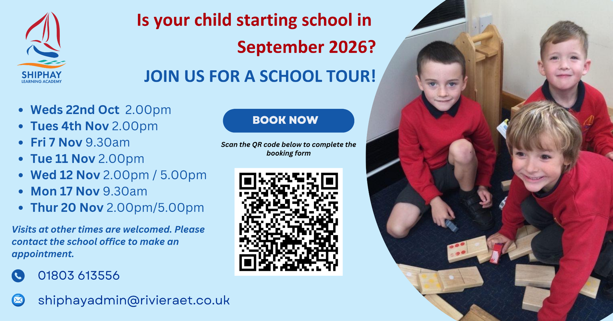Please make an appointment by calling 01803 613556 or by emailing shiphayadmin@rivieraet.co.uk.