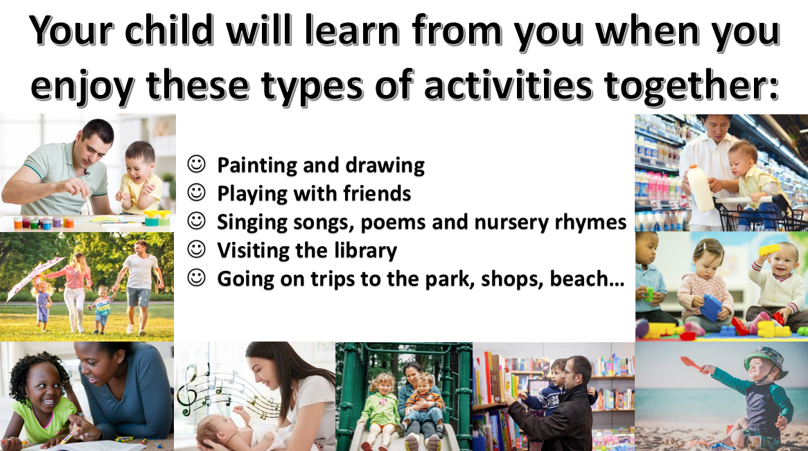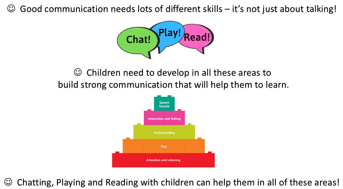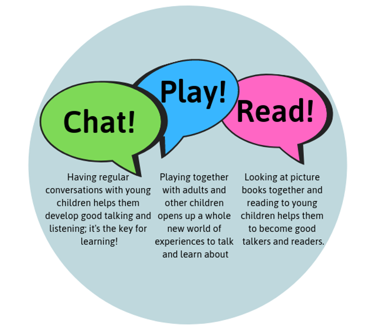 Chat, Play, Read is a campaign launched by the Department for Education to encourage learning at home in the early years of a child's development. The campaign highlights that it is never too early to help develop children’s communication, language and literacy skills and will also provide practical advice on how to fit quality interactions into parent’s daily routines. The aim is to double the number of five-year-olds who start school with good early language and communication skills by 2028.
