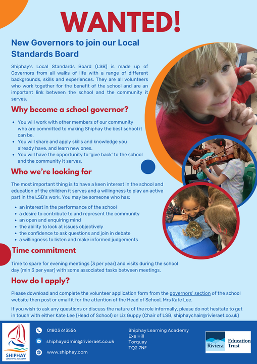 The local governing body is responsible for monitoring standards and school improvement within their school. They hold school leaders to account and report back to the trustees.