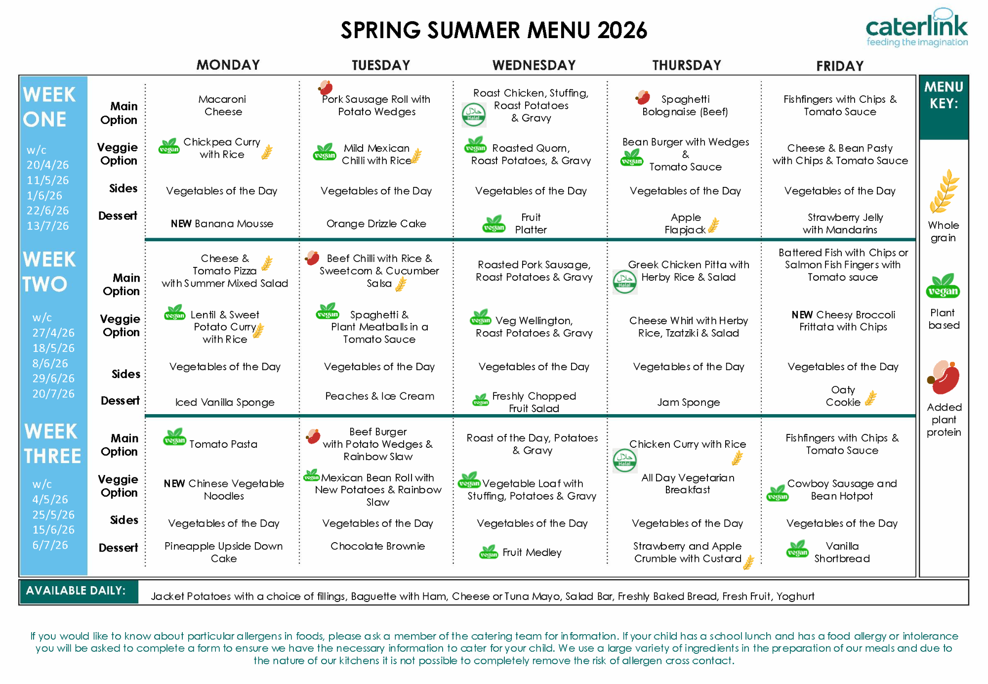 Below is the menu for the Summer Term 2026 that runs from 20th April until school closes for the summer holidays on 21st July.