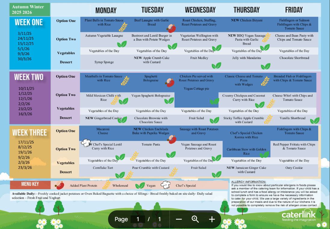 Here is the menu for the second half of the Autumn Term 2025 up until the Easter break (March 2026).